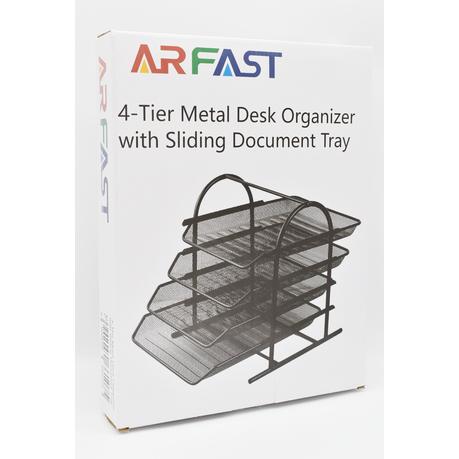 Product name is 4 Tier Stackable Metal Mesh File Holder Stand Organizer Document Tray