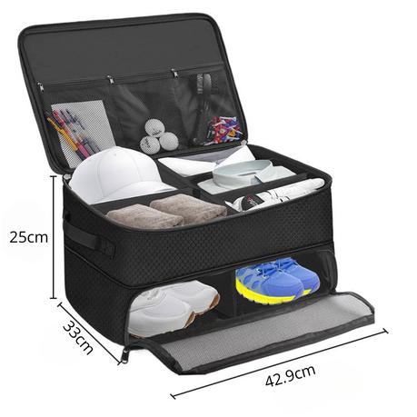 Keep your golf or other sports gear and accessories organized and easily accessible with the Organizer Bag. Designed to fit seamlessly in your car’s trunk, this durable storage solution features two spacious compartments for shoes, accommodating up to US Men’s size 11, ensuring your footwear stays protected and tidy. Product Features: Durable & Sturdy Build:…