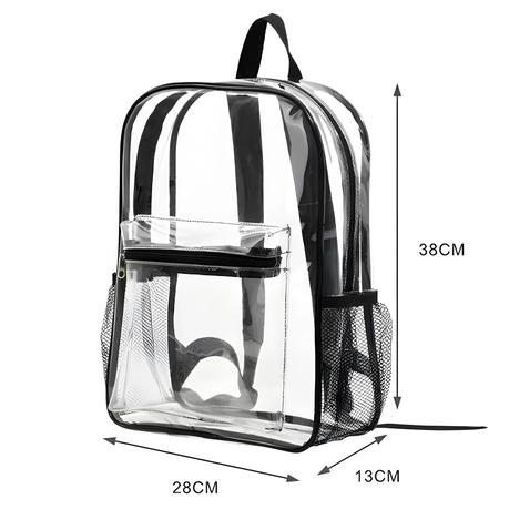 Durable clear PVC backpack with dual-zipper main compartment, side water bottle pockets, padded adjustable straps, and waterproof design,perfect for school, sports, travel, or events. Product Features: Black Clear Backpack with Side Pockets: This durable, transparent backpack is made from high-quality PVC, making it perfect for schools, sporting events, concerts, or any venue requiring clear bags….