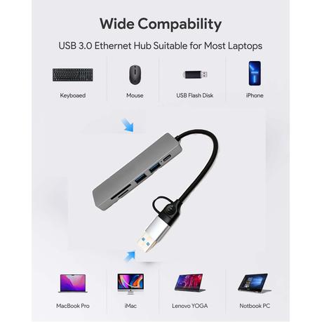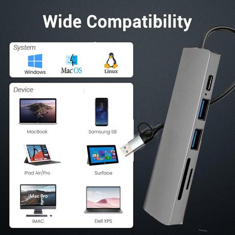SD/TF Card Reader: With the high capacity USB memory card reader, built-in SD and TF slots easily access files from universal SD card and Micro SD card; With the highest speed up to 5Gbps, it is easy to transfer photos shooting or videos by your camera from cards to the laptop in seconds; The USB hub 3.0 each port has built-in over current protection; This protects the connected device from damage caused by short circuits.