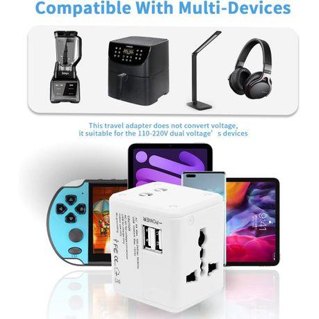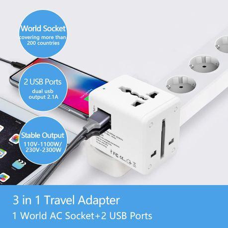 3 in 1 Travel Adapter: The plug comes with 1 world outlet and 2 usb smart charging ports combination,each USB charges up to 5V/2.1A. It is compatible with smartphones, laptops and other devices, ensuring safe and fast charging.