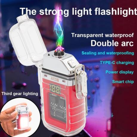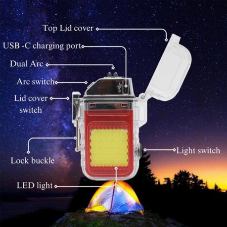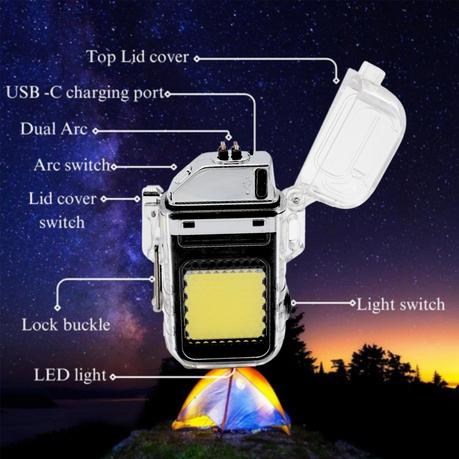 The dual arc electric lighter with LED flashlight, rechargeable battery, water-resistant is perfect for camping and outdoor activities. It is a convenient and versatile tool with a brightness of 400 lumens and a waterproof design.
