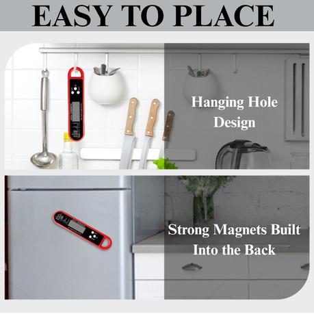 - A large backlit LED screen ensures excellent visibility day or night. Simply unfold the probe to power it on, press ” / ” to switch between units, or hit “HOLD” to lock in your temperature reading.
