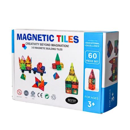 - Set Includes: 60 magnetic tiles in assorted shapes and colors