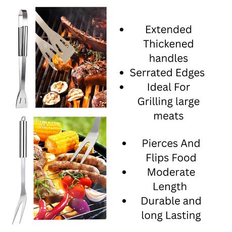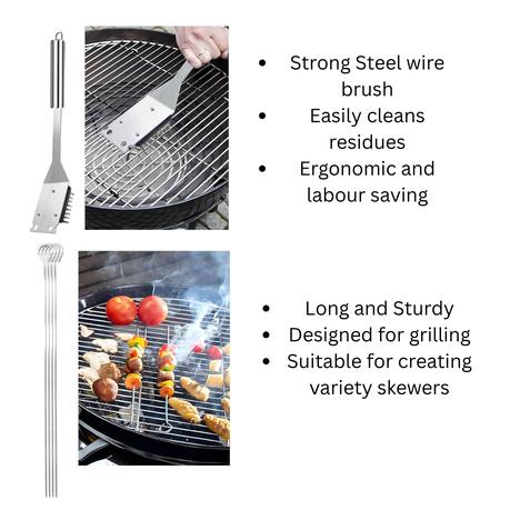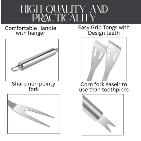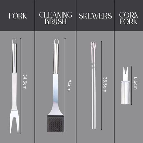 - This complete set includes 1 grill tong, 1 spatula, 1 fork, 1 oil brush, 1 cleaning brush, 8 corn holders, 7 skewers, and 1 durable carry bag. The Tongs and fork effortlessly skewer meats and vegetables without dulling. The silicone basting brush simplifies cleaning and collects ample sauce for uniform application. The BBQ spatula facilitates cutting and flipping with ease.
