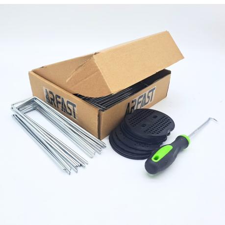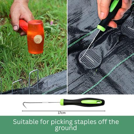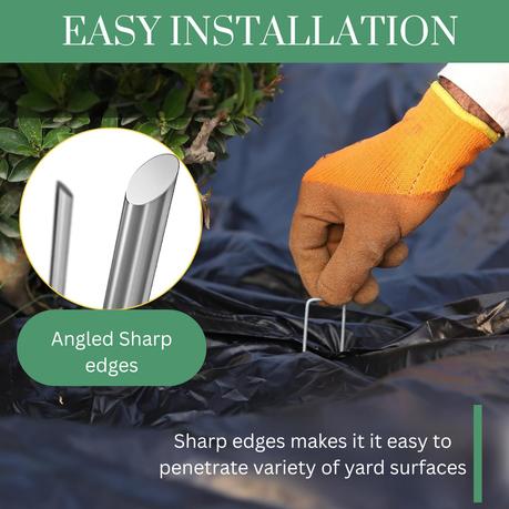 - User-Friendly Design:The U-shaped construction and beveled tips of these landscaping staples ensure smooth and effortless insertion into turf and soil. Designed with versatility in mind, the adjustable base width allows the staples to adapt to a wide range of ground cover applications, making them a practical choice for both home gardeners and professional landscapers. They also come with 50 plastic gaskets to flatten edges of tents, and hook picking tool to make it to pick them off the ground.
