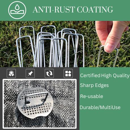 Secure your landscaping projects with confidence using these heavy-duty landscape fabric staples. Made from durable 11-gauge galvanized steel, each U-shaped staple measures 15cm in length, with a 3cm top width and a 1.5-inch adjustable bottom width for added versatility. This 50-pack is ideal for both residential and commercial use, offering a reliable solution for anchoring a variety of garden and outdoor items.