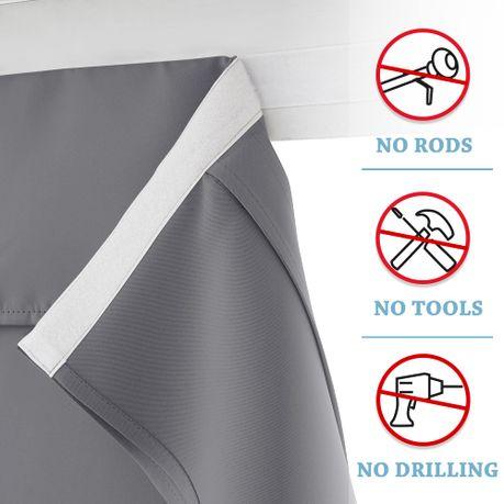 - Crafted from 100% high-grade polyester, this curtain offers durability and long-lasting performance. It comes with both a rod pocket and a sticky strap for easy, flexible installation – no tools required.