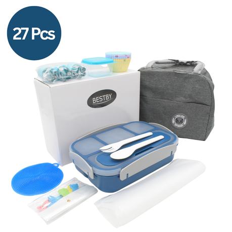 Complete 27pcs Meal Prep kit with 4 compartments lunch box, utensils, snack bags, fruit forks, molds & more. BPA-free, microwave & dishwasher safe. Great for kids & adults, easy to clean and perfect for meal prep.
