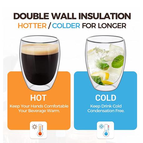 – Unique design: With the 2-layer design of each set, these glass mugs will keep your hot or cold drink stay hot or cold for longer while you will always feel cool to touch, and with the transparent design of each mug, gives you a crystal-clear view of your cold or hot drink