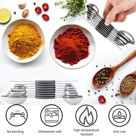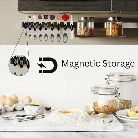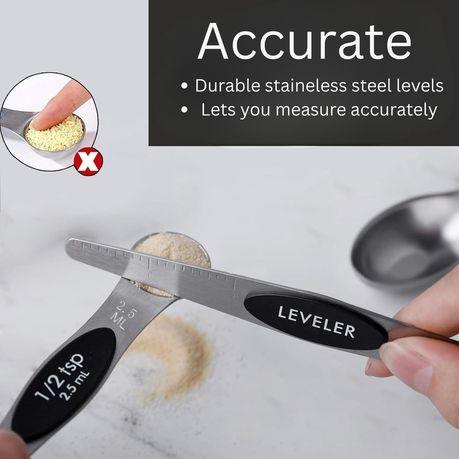 - Magnetic Nesting System: Strong internal magnets keep the spoons and leveler neatly stacked together, ensuring compact, clutter-free storage and easy access in any drawer or on metal surfaces.
