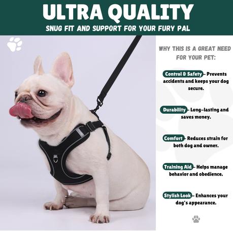 Even Pressure Distribution. Reduces tension on the neck by evenly spreading force across the chest and shoulders, encouraging better posture and behavior during walks.