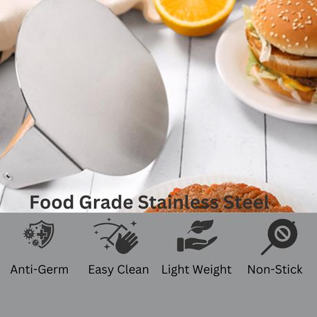 The Stainless Steel Burger Press with Non-Stick Coating for easy cleaning, durable construction , and compact size for easy storage. It can make perfectly shaped burgers every time, making your grilling experience more enjoyable. With its non-stick coating, you can easily remove the burger patty without it sticking to the press.